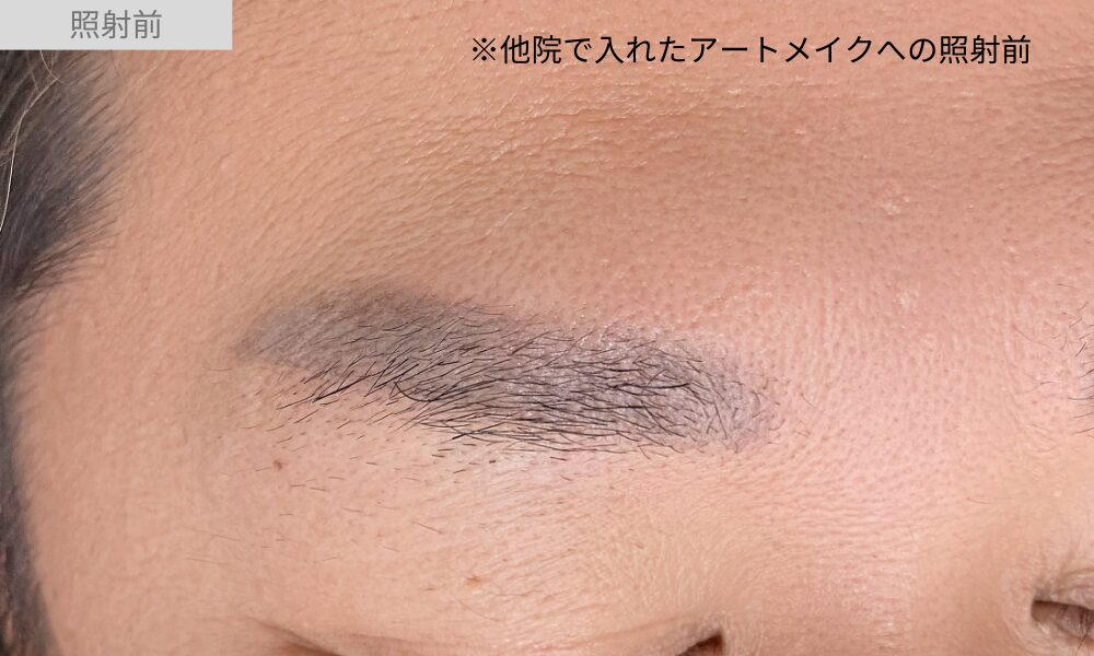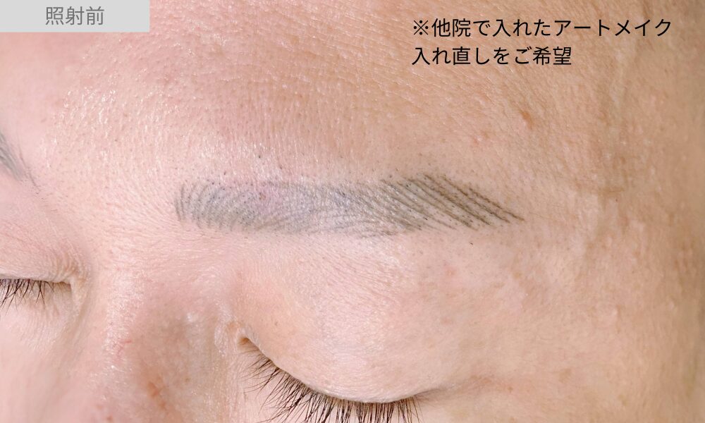 西川式アートメイク除去で1回の照射を行いました。色の濃さを見極めながら、全体的にしっかり照射します。はっきりとしたアートメイクの印象が全体的に明るくなりました。