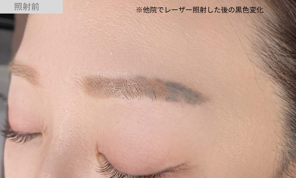 このゲスト様は、アートメイクを除去するために他院でレーザー照射を行いました。レーザーがアートメイクのインクと反応して部分的に黒っぽい色に変化してしまいました。
