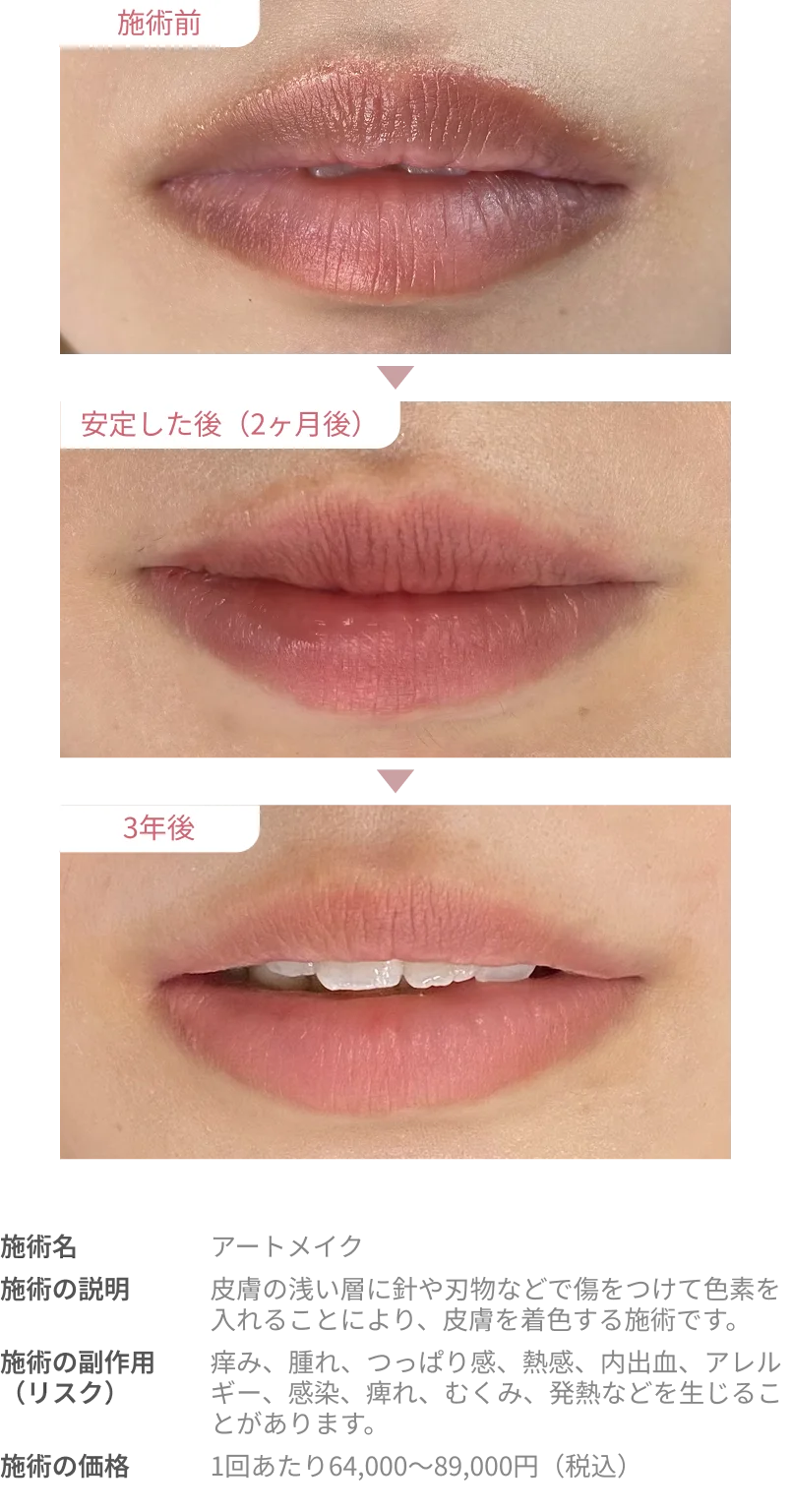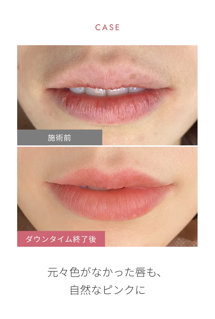 A5.施術当日は、リップメイクや強い摩擦はお控えいただく必要があります。翌日以降、経過を見ながら徐々に日常のメイクに戻していくことが可能です。詳しい注意事項は当日ご案内いたします。